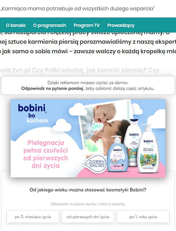 Display • Social media (Facebook, Instagram) • Portale horyzontalne • Serwisy parentingowe • Programmatic • Gazetki promocyjne • Spoty wideo (YouTube) • Rich media • MMSy